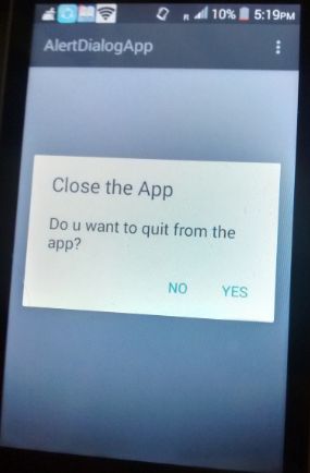 the Android app. It is used to display the dialog message with Yes and No or OK and Cancel buttons. It can be used to ask the user about his/her choice to continue or discontinue.