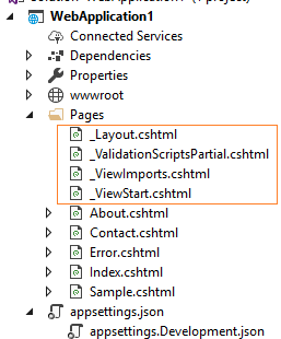 Next, we will quickly look at a few of the files which are added by default under a Pages folder with some pre-specified lines of code.