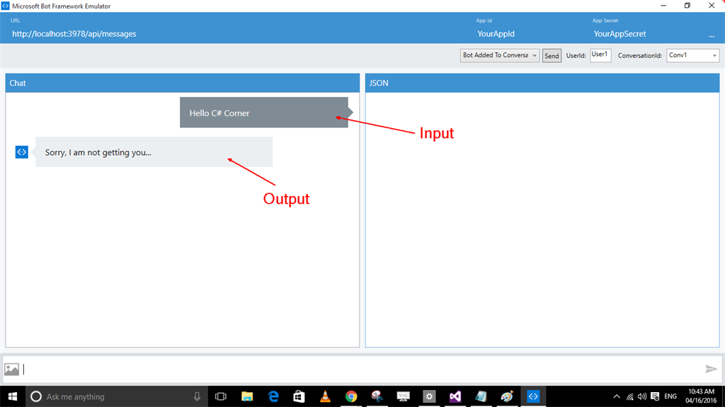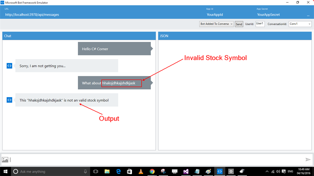In the above figure you can see that message is not more conversational I am just sending input as msft and getting result but for our users, it will not be more interactive.