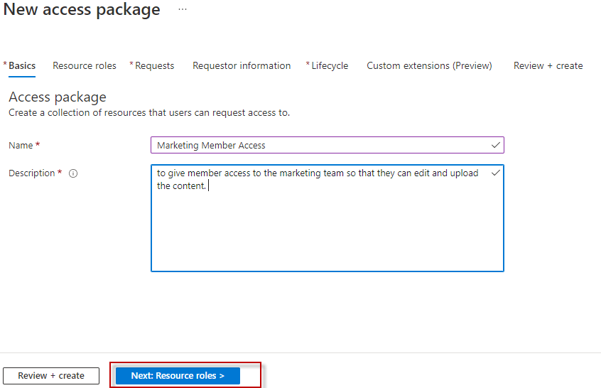 In the ‘Basics section’ enter the name and description and now proceed to ‘Resource Roles’
