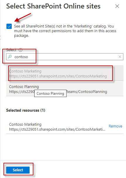 In the ‘Resource Roles’ select ‘SharePoint site’. Search for ‘Contoso’ as I want to give Contoso Marketing sites access to user group ‘Team.SPO.Marketing.Users’.