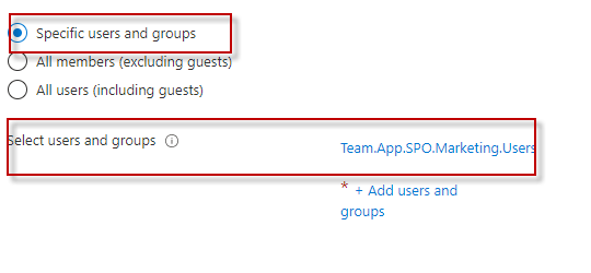 Now select for specific users and groups, and in the search option select the required group, In this case, I have chosen ‘Team.App.SPO.Marketing.Users’.