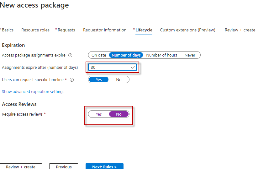 In the ‘Lifecycle’ section, I have updated the number of active days from 365 to 30. You can change it to your needs accordingly. I have selected ‘Access Requests’ to ‘No’. If selected yes, you will have more options like how frequently the active access needs to be reviewed and by whom, whether it is self-reviewed or Manager reviewed.