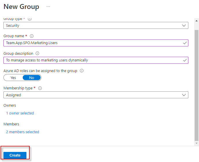 The above steps conclude the creation of Azure AD group.