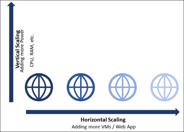 In horizontal scaling, we add more machines (VMs) with the same configuration. Horizontal scaling requires more complicated structure such as load balancer, and we must ensure all resources are in sync. Using this scaling method, we can increase the availability of websites and also, we can create a failover region (setting up resource which hosted in a different region). We can either scale-up or scale-down based on the traffic on the web app.