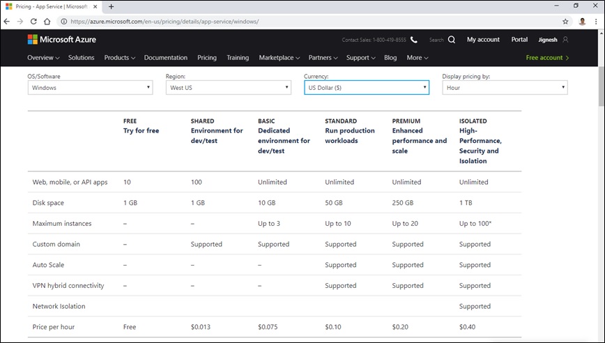 Azure App service brings everything together that we require, create websites, web APIs, and mobile back-end for any platform or device. It provides a very cheap rate and enables us to select any plan as per requirement. The free and shared plans provide options to test our application within our budget. A dedicated Virtual Machine plan is also available. It contains three sub-categories: Basic, Standard, and Premium. The isolated plan hosts our application in a private and dedicated Azure environment. You can also check App Service pricing on