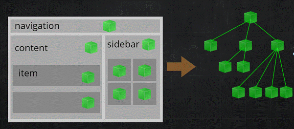 Components are helpful when you need to "expand" the main HTML elements and embed reusable code. Basically, components are reusable UI parts. On the app’s design state, we break down the app on several separate parts and create a hierarchy of components. Like this,