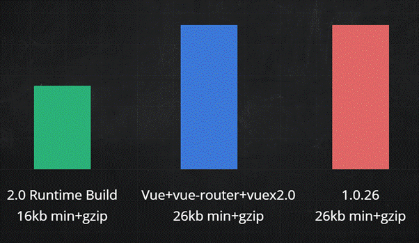 - It doesn’t weigh much. Runtime builds Vue.js 2.0 weighs only 16kb; 26kb with vue-router and vuex (quite similar to the first version of Vue.js).