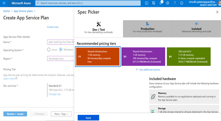 - Click Change size option and choose Dev/ Test and select Free option as shown below and click apply.