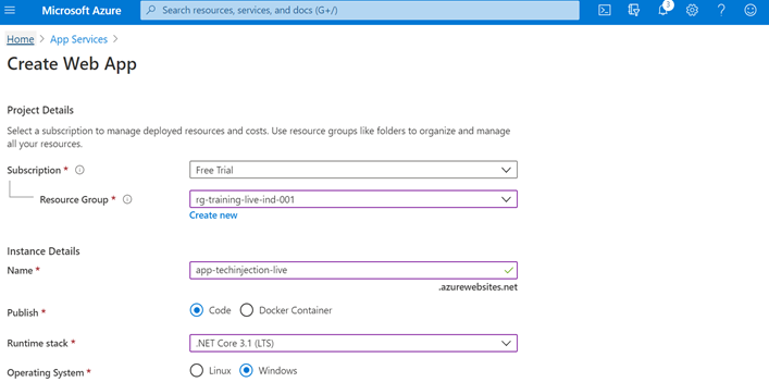- Create Web App, Choose the Resource Group we created earlier, Type the name of the app (User Defined) as shown below.
