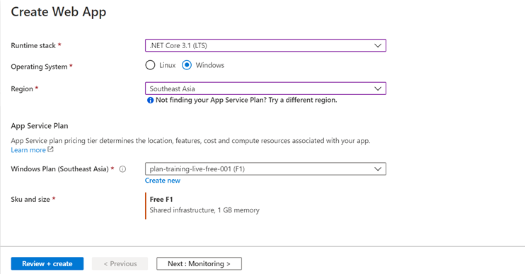 - Provide the Region which is provided in the App Service Plan. In our case, it is Southeast Asia, once selected the region, automatically the App Service Plan section will be filled.