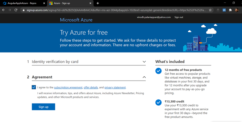- Finally, Click the Agreement and Sign up for Azure Portal Services as shown below,
