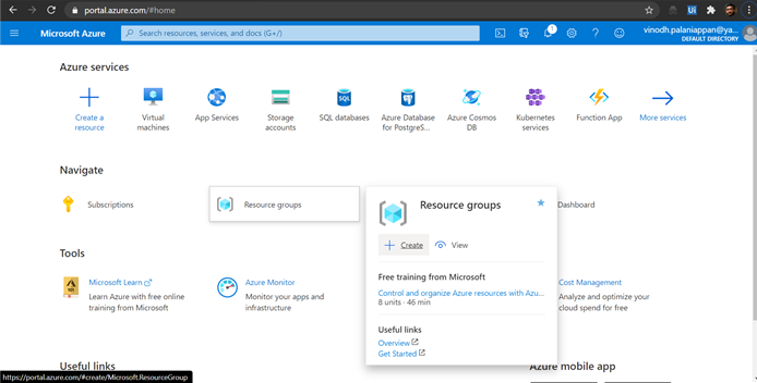 - Click the create option from Resource groups as shown below,