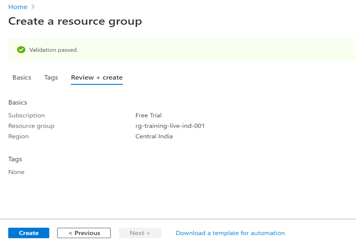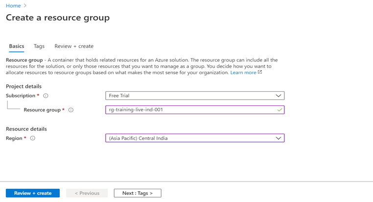 - The resource group name is defined based on the grouping strategy. In this case, we will follow the standards to give a name as rg-training-live-ind-001 (rg stands for resource group) and since I am creating this group for live deployment for training project, I am adding live keyword along with the name, and ind-001 indicates, the selected region is India with 001 indicating first resource group.