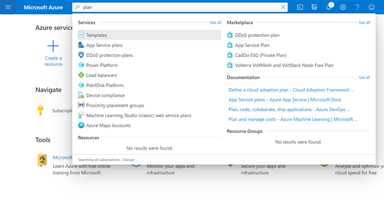 - Type plan in the search option, which will show the App Service plan option, select that as shown below: