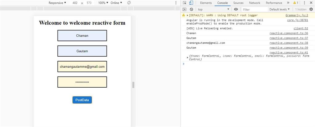 Now you can see console don't have any errors, now press the postdata button and check all values are stored in console or not.