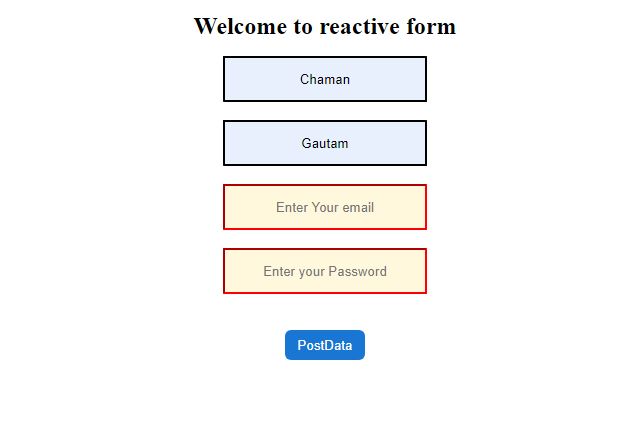 Now you can see the form empty field is red because the user touched these fields but can't add any value in the fields. The postdata button is disabled now. that means our forms validations are working properly.