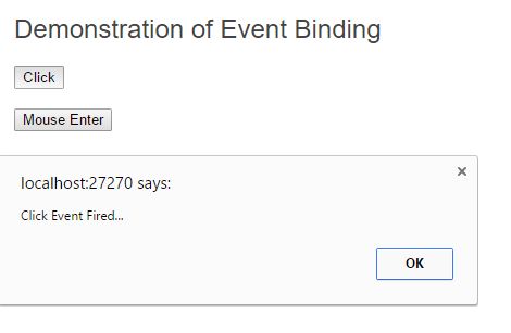 Event Binding is one of the new mechanisms introduced by AngularJS 2.0 an a new concept. In previous versions of AngularJS, we always used different types of directives like ng-click, ng-blur, for binding any particular event action of an HTML control. But in Angular 2, we need to use the same property of the HTML element (like click, change etc.) and use it within parentheses. So, in Angular 2, with properties, we use square brackets and in events, we use parentheses.
