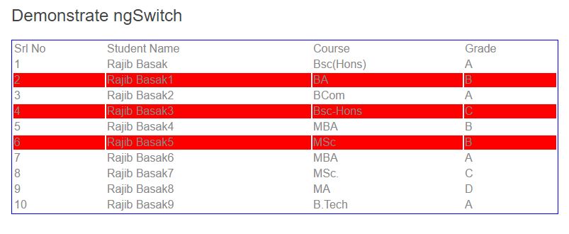 Now, we will create another table list type component, where on click on any table row, table background will be changed. For doing this, first we need to create a student list. For this, we will use ngSwitch directive.