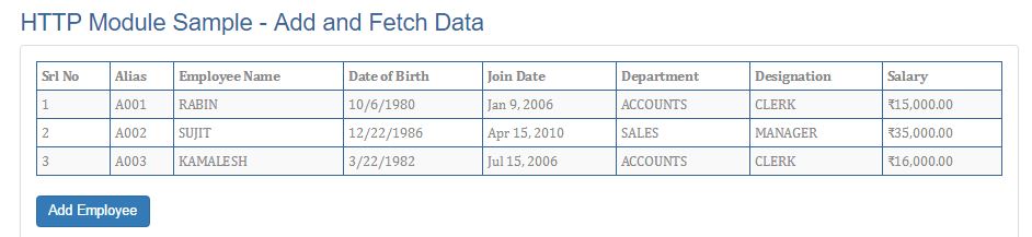 In the Web API Controller, we initially stored three records. And after it, when user fills up the employee form and clicks on Submit button, that particular record will be appened along with these three records.