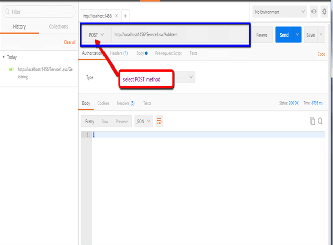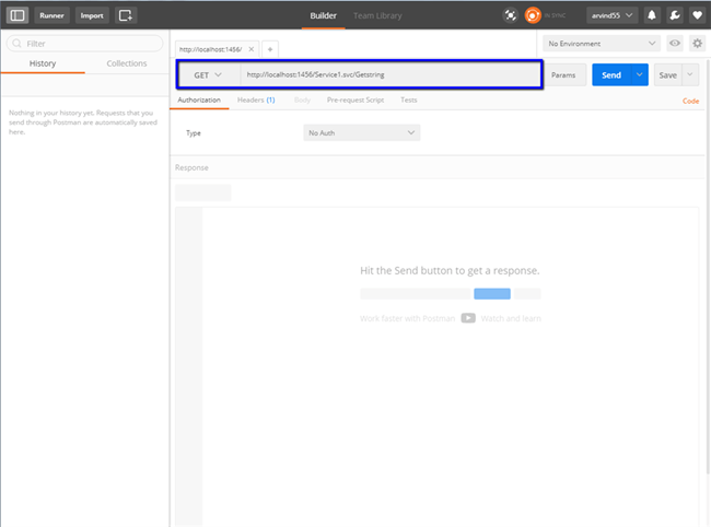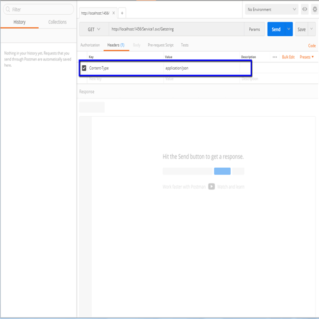 - First we execute the GET Method using postman. I have one GET API http://localhost:1456/Service1.svc/Getstring that would be executed with the postman. Please follow the below listed steps.