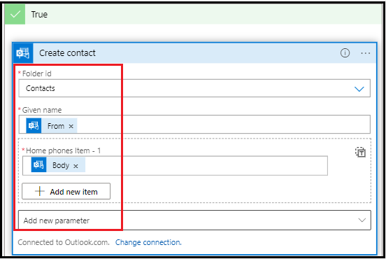 - Then, if true, choose an operation such as outlook for creating contacts.