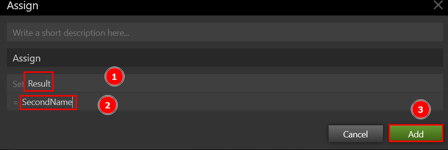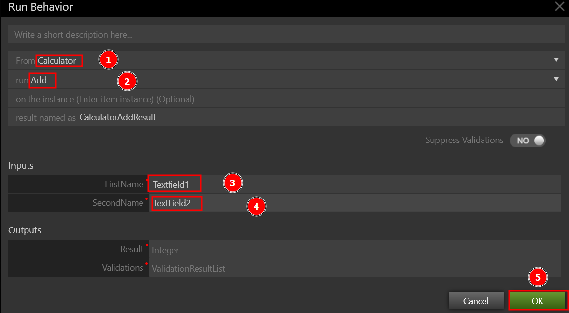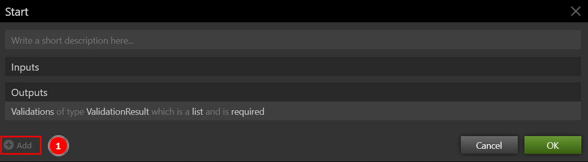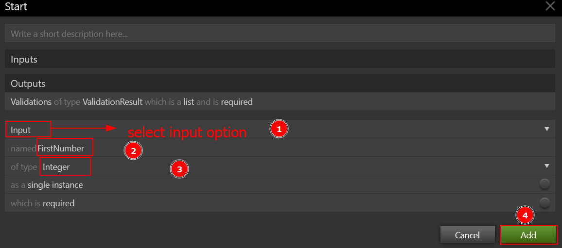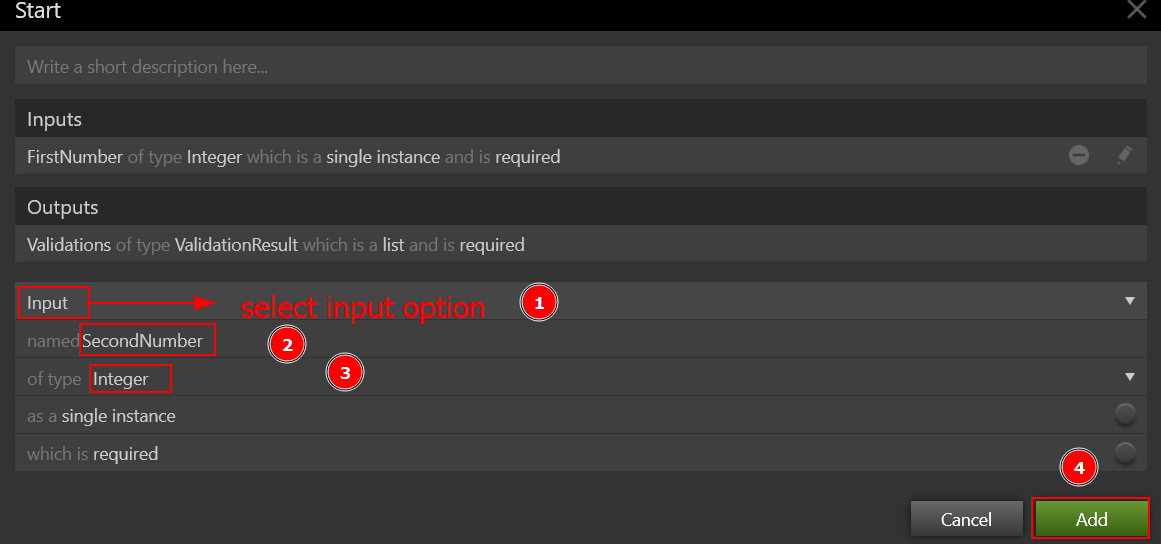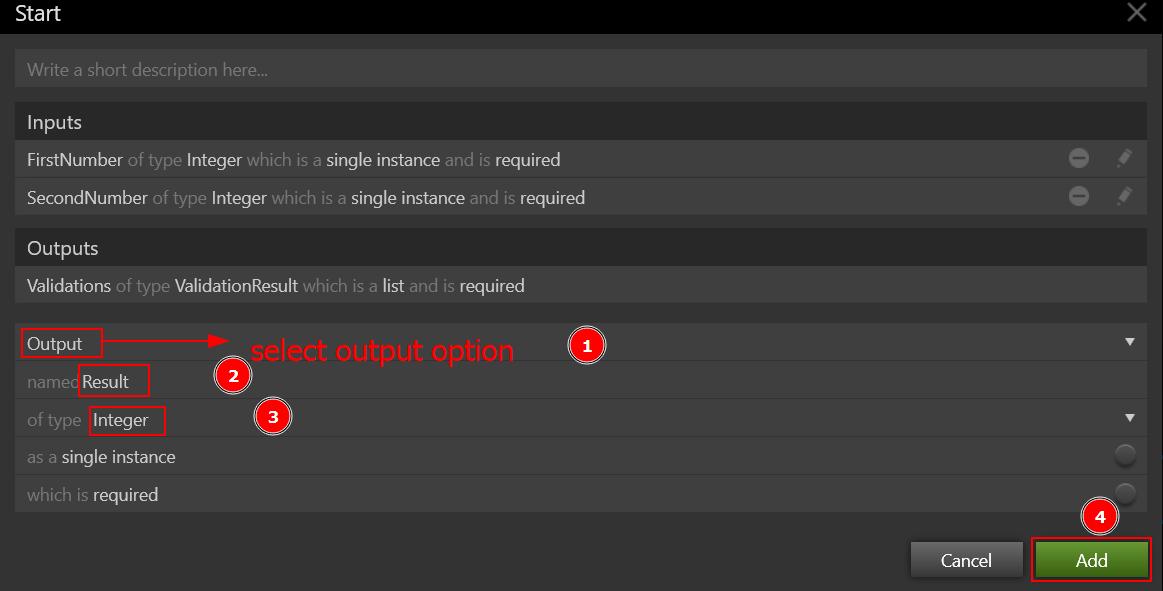 The Inputs and Outputs are set using the Start shape. The user can add one variable, either Input or Output, by clicking the Add link. Variables can be declared as Input/Output in various instances. This simply means that, despite being received as an Input, the variable is returned as an Output. Select Enter Behavior Name and type Add as the behavior's name. The following box appears when you double-click on the Start shape.