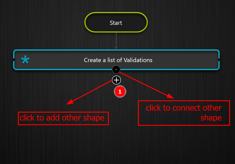 A shape can be linked to its siblings using a drag-and-drop technique, where the shapes are dragged from the left-hand rail, or by holding over the shape and clicking the Plus or Dot icon that appears. The Plus icon is used to create and link additional shapes to the existing ones. context of shape The Dot icon is used to connect two forms in a Behavior that already exists.
