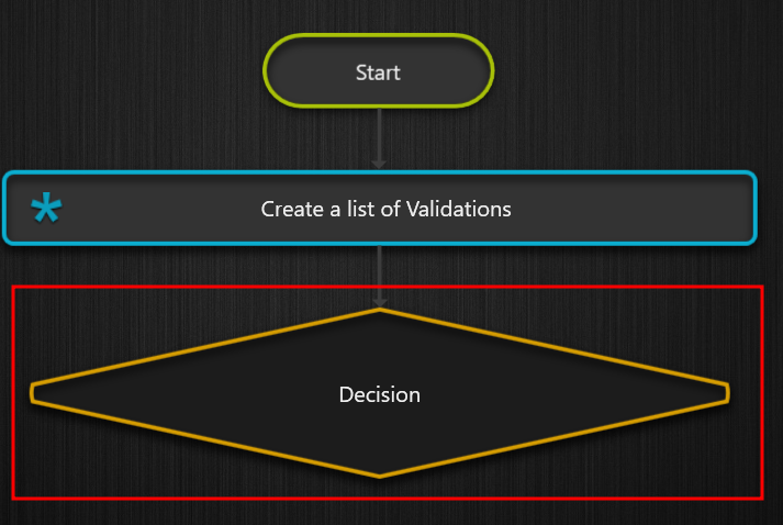 The Decision shape allows the user to add two shapes: one for logic when the condition is true and another for logic when the condition is false. The true condition will be represented by the word Yes above the connecting line in the first shape added to the Decision form. The false condition is indicated by the word No over the connecting line in the next form.