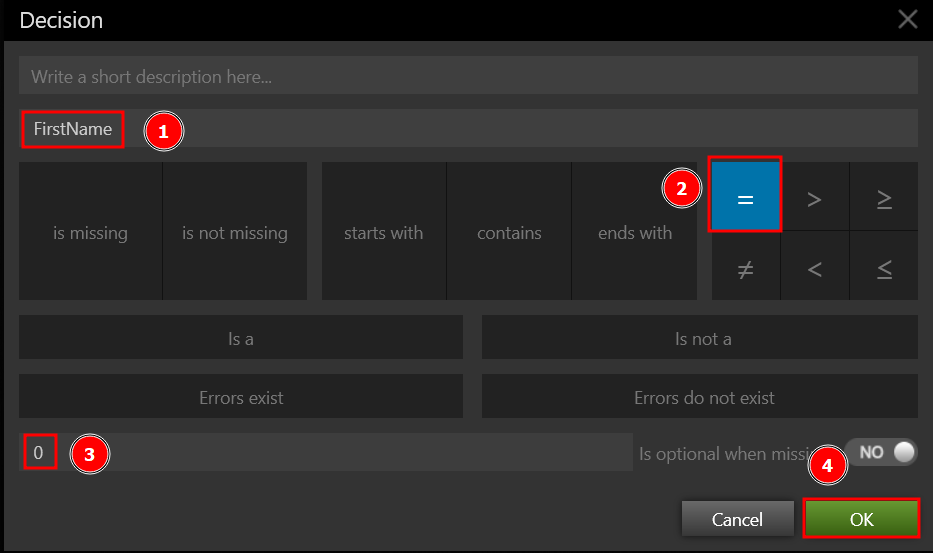 If FirstNumber is Equal to Zero, is the If condition for the sample project. Enter the input variable FirstNumber in the field above the operator shapes in the Decision shape to accomplish this. Then press the = key. Then, below the operator's shapes, type 0 in the field.
