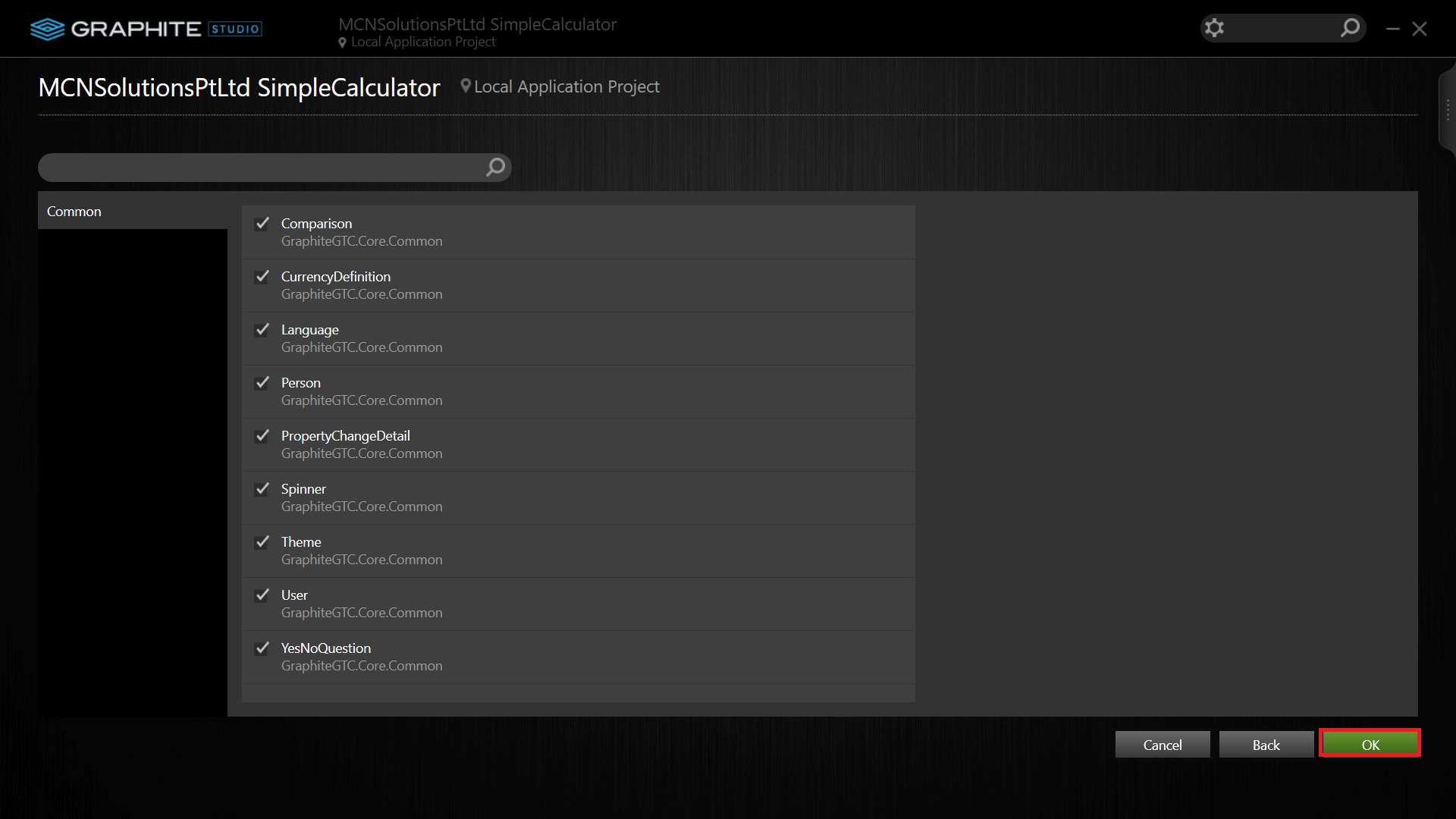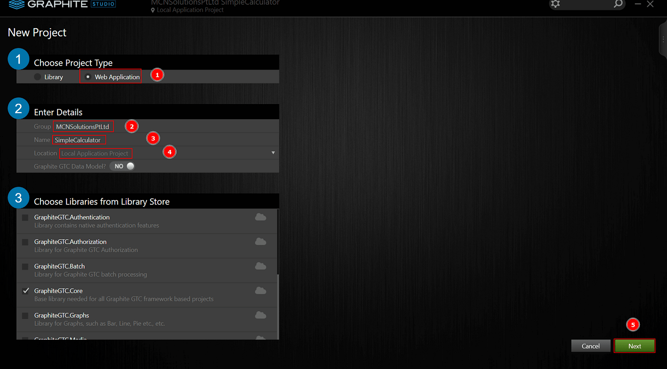 I entered SimpleCalculator and then Select Local Application Project as the project's location from drop-down list. Choose Libraries from Library Store gives you a list of all the libraries that are available on your machine. The only library necessary for our SimpleCalculator project is GraphiteGTC.Core. All Graphite Studio Projects will require this base library, which must be selected. Now click the ok button
