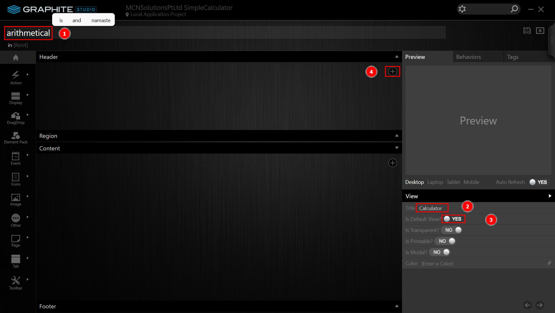 Enter the name of the View as arithmetical. Below the Preview Section is the Properties Section of the View. Set the Title to Calculator and set the Is Default View yes