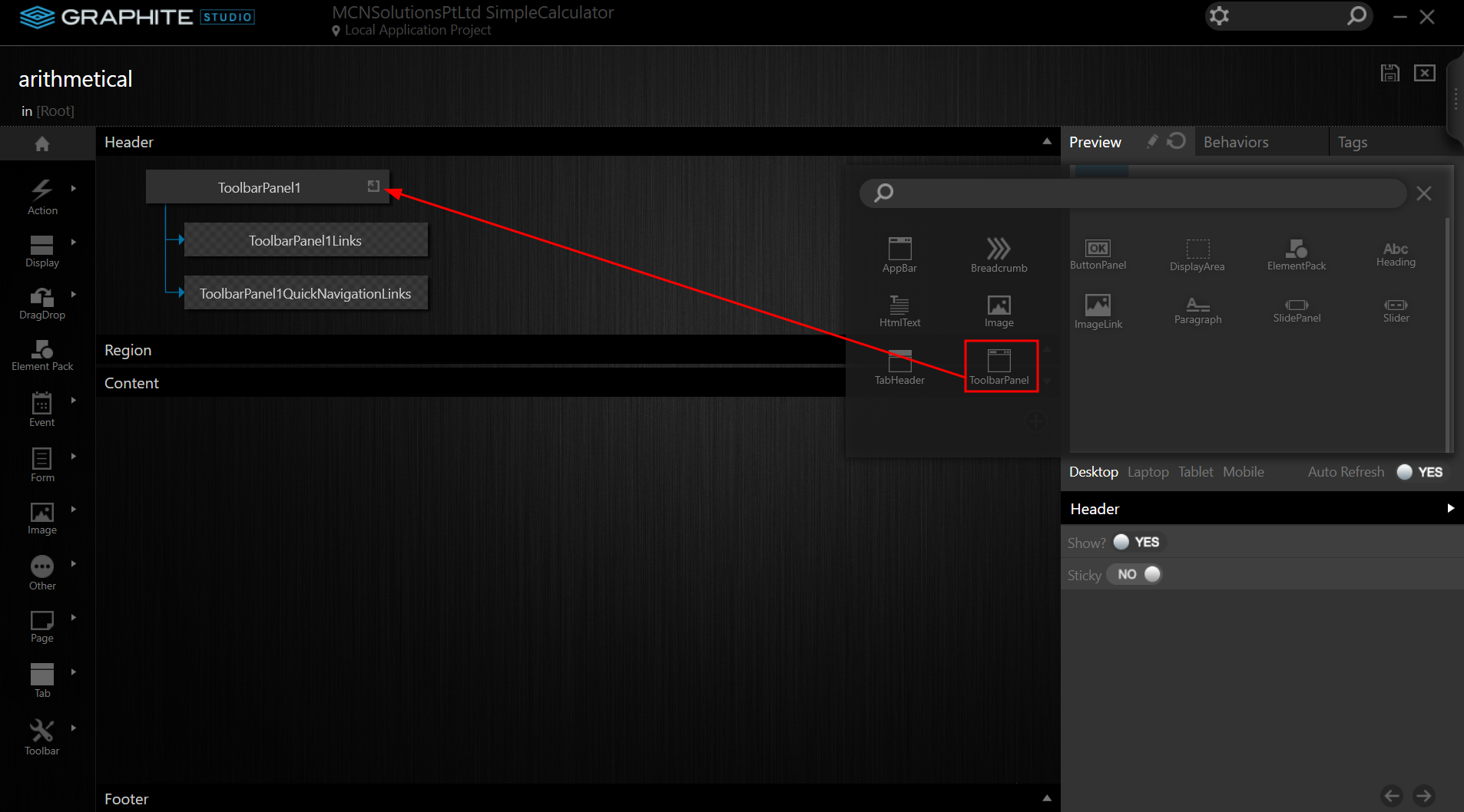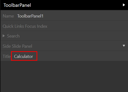 Every instance of a View Element that is placed in a View has a set of characteristics that aid in the display or operation of the View. There are various properties on the Toolbar Panel View Element. Set the Title attribute to calculator for this project. The Toolbar Panel is updated with the title from the Preview Section once more.