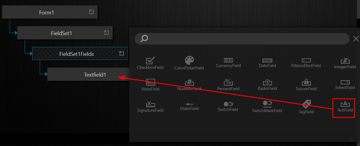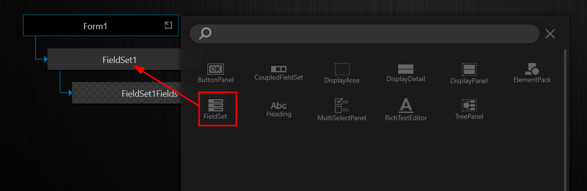 Using the Add View Element button to the right of the Form1 View Element, add a FieldSet (FieldSet1) View Element to the instance of the Form View Element. |