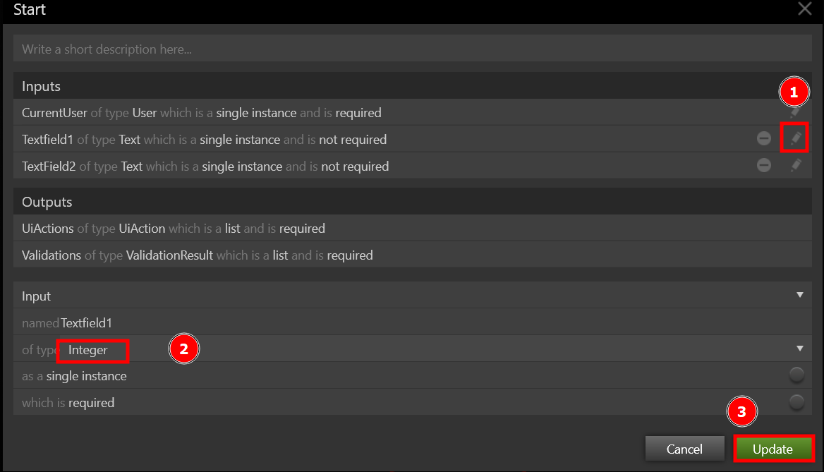 The TextField1 and TextField2 are declared as a Text that is not required in the Start shape and the Run Calculator in the Add, Subtraction, Multiple, and Divide shape. We also know that depending on the mask you've set up, we'll only allow users to enter an integer in TextField1 and TextField2. To alter the TextField1 and TextField2 variables in the Start shape, click the Pencil icon next to them and change their type to Integer. Check to see whether it's set to not necessary.