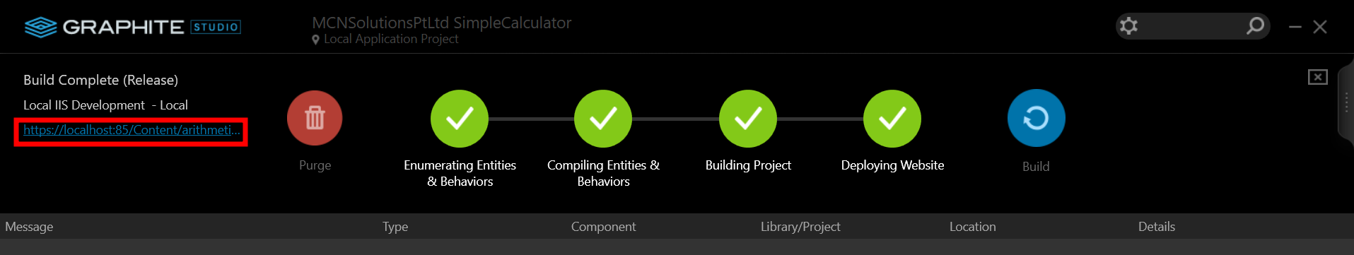 Graphite Studio offers the user with a URL link to the web application that was built after a successful build. The link opens the default browser and takes you to the Web Application Project's Default View.