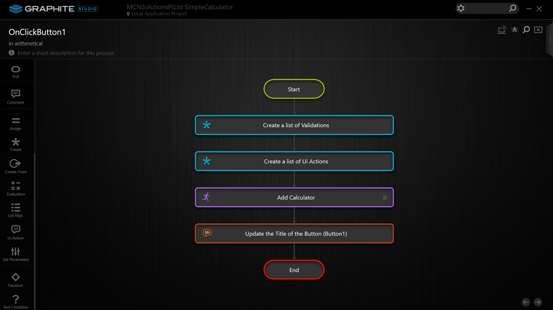 Some automatically produced variables are also included in the Start form of the OnClickButton1. two input variables are set up in Graphite Studio using the information from the Button1 Properties Section. The variables that Graphite Studio automatically generated can be seen in the diagram below.