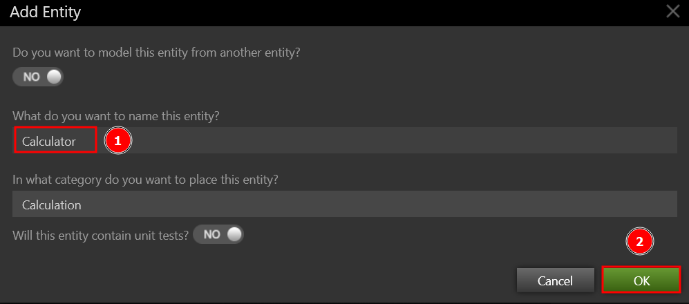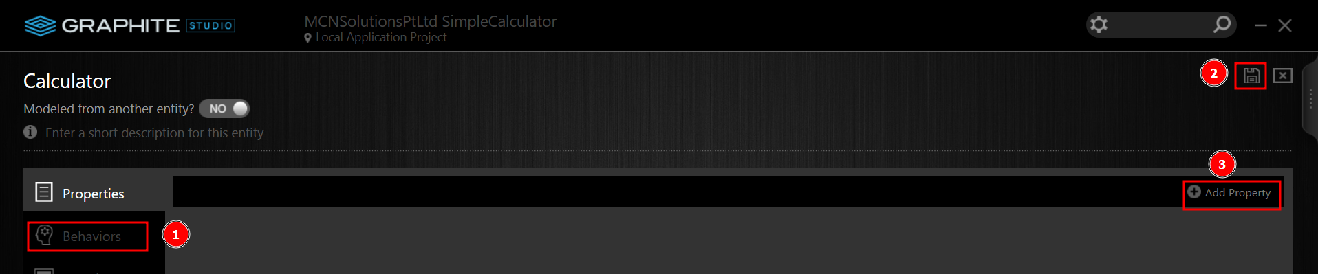 Enter Calculator as the Entity's name field as shown in figure-7 then click OK to return to the Calculator Entity Screen. To save the details of the Entity, go to the Calculator Entity Screen and click the Save button (upper right corner). You will not be adding any properties to the Calculator Entity in this project. Simply add four behaviors to calculate the Add, Divide, Multiple, and Subtraction for given two numbers.