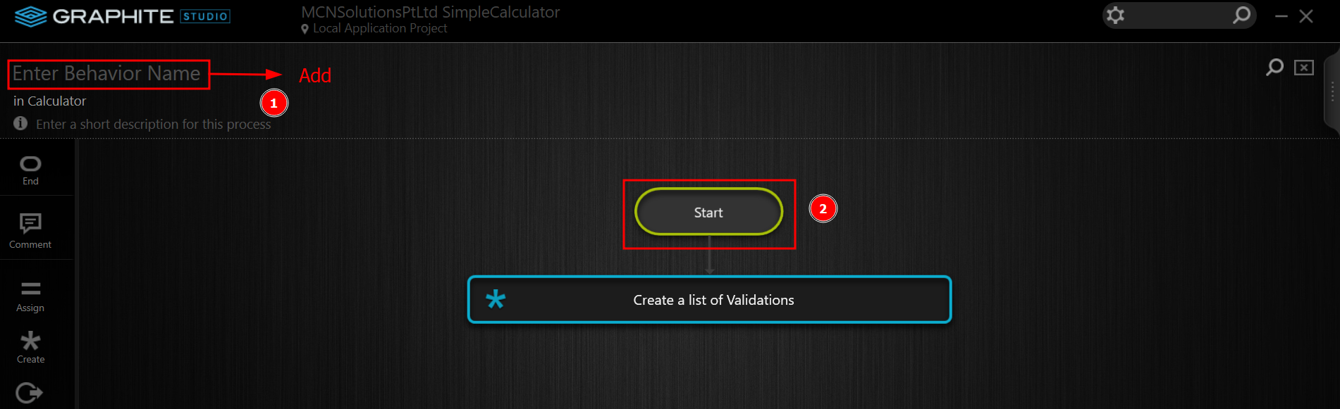 In a Use Case, a Behavior is a verb. In object-oriented programming, it's the equivalent of a method. A Behavior of an Entity in Graphite Studio comprises the business logic required by the Entity. The Behaviors tab of the Entity Screen lists all Entity's behaviors. To add the Behavior that will calculate the Arithmetic operation, click the Add Behavior option.