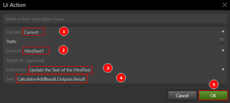 Any View Controller Behavior (excluding the OnLoadView Behavior) uses the Ui Action shape to update the View. To allow the user to adjust the current View, the Ui Action shape gives a range of Instructions based on a selected Element. When the context is in a modal View, it also allows the parent View to be updated. Add the Ui Action shape to the Run Behaviorshape to update the HtmlText View Element with the Result output from the Calculation Behavior. The details of the Ui Action required are shown in the diagram below. Leave the Context at Current because the View being modified is already in context. Static should be left alone. An Ui Action's instructions are based on a View Element that has been selected. In the Element area, select HtmlText1.