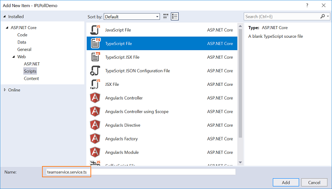 Right click on Sevices folder and select Add >> New Item. An “Add New Item” dialog box will open. Select Scripts from the left panel, then select “TypeScript File” from templates panel, and put the name as teamservice.service.ts. Click Add.