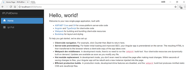 A web page will open as shown in the image below. Notice the URL showing route for our home component. And navigation menu on the left showing navigation link for Ipl Poll page.