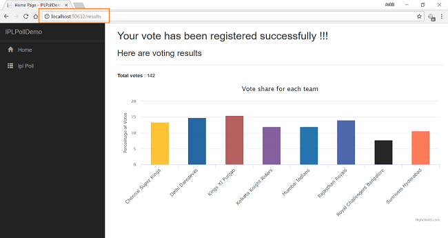 Click on the vote button to vote for your favorite team. You will be redirected to the results page showing the poll results as a column chart.