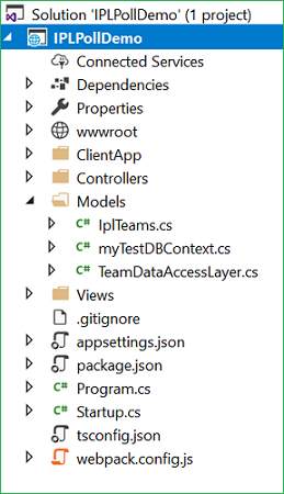 Right click on Models folder and select Add >> Class. Name your class TeamDataAccessLayer.cs and click Add button. At this point of time, the Models folder will have the following structure.