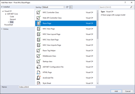 Add a folder called Pages and add Index, _Layout, _ViewImports, and _ViewStart pages to it. These pages are no different than MVC. Also, add a folder Movies for your CRUD pages.