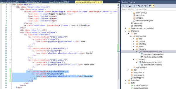 To add our new navigation menu, open the “navmenu.component.html” under navmenu menu. Write the code given below to add our navigation menu link for the students.