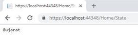 In this Controller, you can see two action methods − State and Country, which will return just a State and Country name respectively. Let us save this file and specify /Home/State at the end of the root URL.
