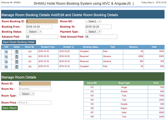 This is a simple web based Hotel Room Booking developed using MVC and AngularJS. This application can be extended to add more features as per your requirement.