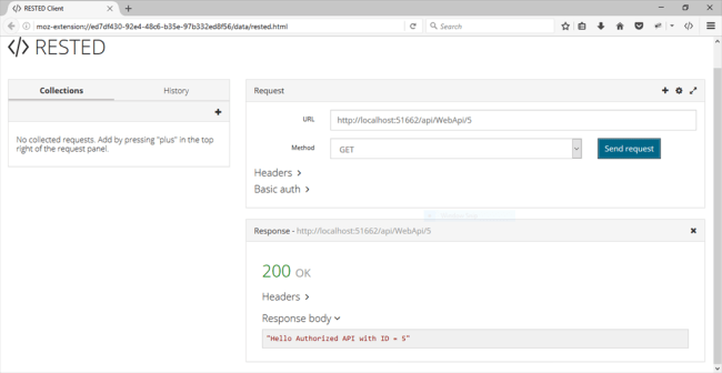 - Let's test out REST Web API in REST Web API client. I am using Firefox plugin i.e. "RESTED". At first, I simply try to hit the REST Web API without any authorization details and I will get the following response.