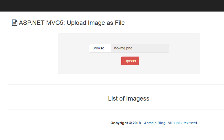 In the above code, I have created a simple View for uploading an image file to the server and to store the file path into the SQL database and then display the list of uploaded image files. I have created a bootstrap style file upload control and a table to display the list of uploaded images on the server.